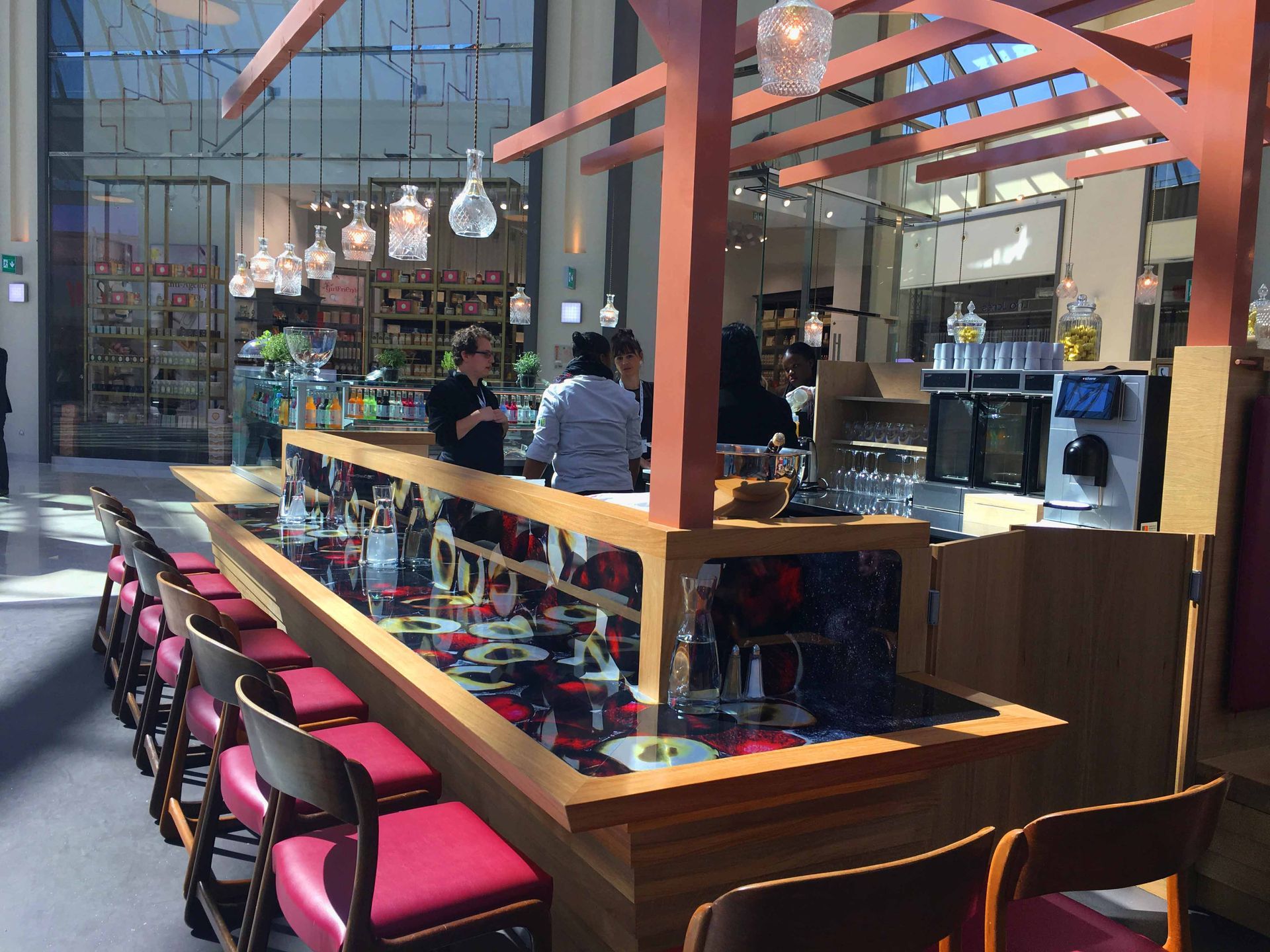 Pour « Les Petits Producteurs, du vin et de la cuisine », Mathilde de l’Ecotais avait imaginé un design transversal, en investissant — entre autres — le bar et les tables avec cette photographie de grains de raisin rouge. Reconstituant une grappe, elle transforme l’espace. Son regard, sublime la matière en faisant dialoguer l’image du raisin avec l’univers du vin et de la gastronomie.