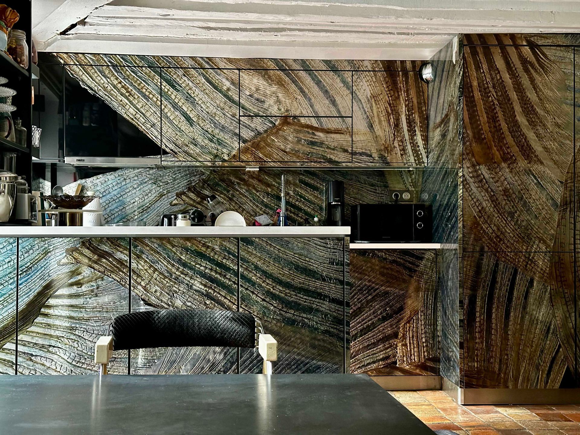 This fin, mounted on a movable panel, appears like a knife pointing at the cook. An iconic image from this Japanese series, it has also been used as a set design for a television program, in bathrooms, and as furniture. At the Mondrian, in the lobby of the legendary hotel on the Croisette in Cannes, redesigned in azure blues, it evokes the sea and the breath of the open ocean...